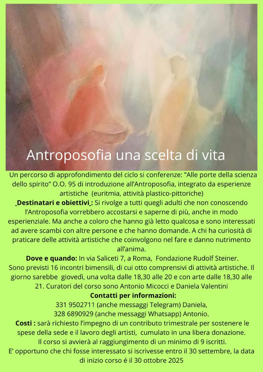 Dal 30 ottobre 2025, due giovedi al mese ore 18.30-20Un percorso di approfondimento del ciclo si conferenze O.O. 95, integrato da esperienze artistiche che seguono gli impulsi dell’Antroposofia (euritmia, musica, attività plastico-pittoriche)