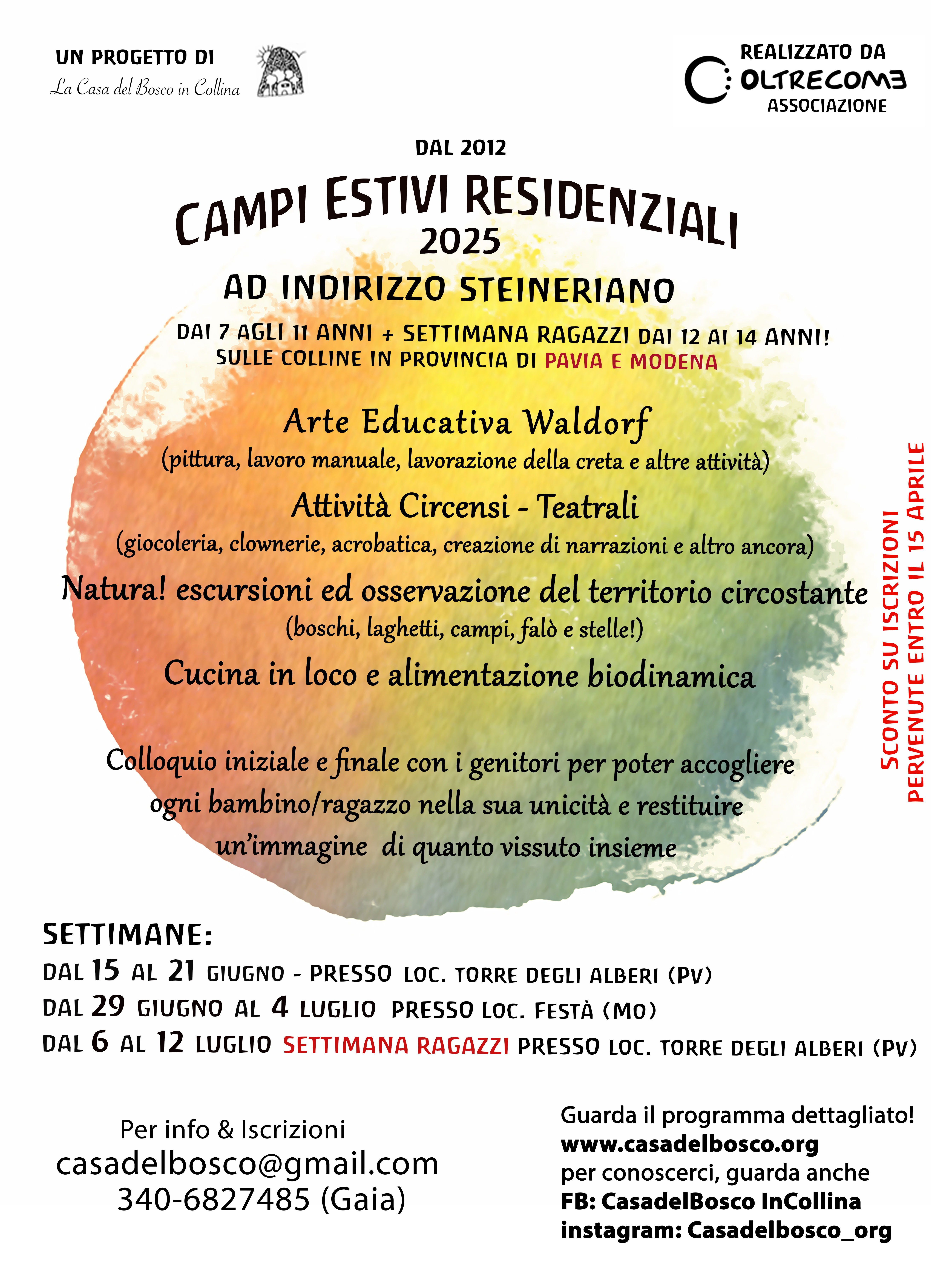 SETTIMANA RAGAZZI Torre degli Alberi (PV) Costo: 520 + tessera associativa Sconti: per iscrizioni entro il 15 di aprile, per fratelli e per la settimana di Modena Contenuto: ✔️Arte educativa Waldorf ( pittura, lavoro manuale, creta, panificazione e altre attività ) ✔️ Attività Circensi-Teatrali (Giocoleria, Clownerie, piccolo circo acrobatico e altro ancora) ✔️Natura! passeggiate ed esperienza del territorio circostante (boschi, laghetti, campi, falo e stelle!) ✔️Atmosfera accogliente: cura dei ritmi della giornata, clima famigliare ✔️Colloquio iniziale e finale con i genitori per poter accogliere ogni bambino nella sua unicità e restituire una immagine di quanto vissuto insieme ✔️ Cucina in loco ispirata ai principi dell'alimentazione biodinamica contatti: mail: casadelbosco@gmail.com Tel: 3406827485 (Gaia) Per conoscerci: www.casadelbosco.org FB: Casadelbosco InCollina IG: casadelbosco_org