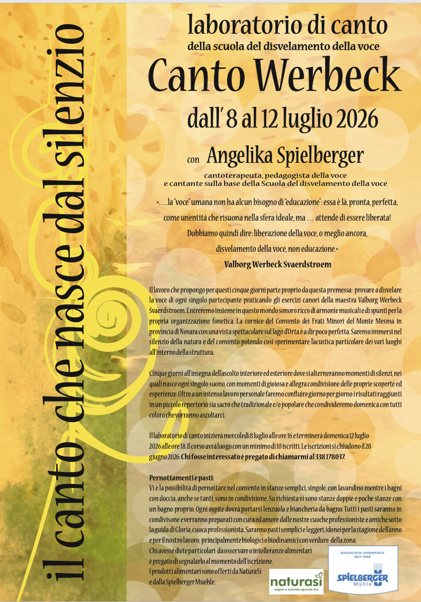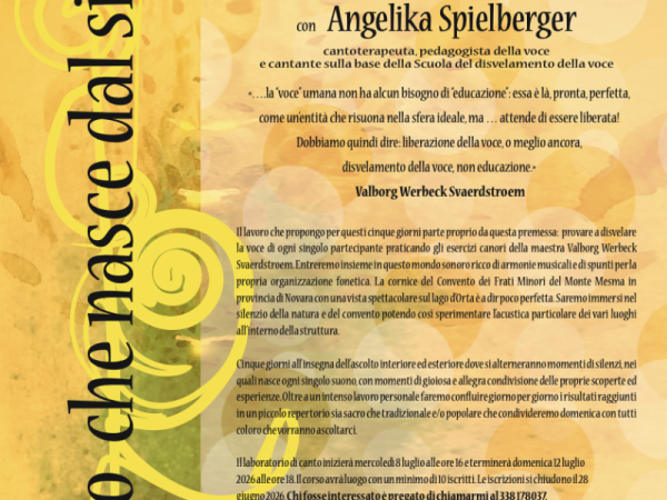 Il laboratorio di canto inizierà mercoledì 8 luglio alle ore 16 e terminerà domenica 12 luglio 2026 alleore18.Il corso avrà luogo con un minimo di 10 iscritti. Leiscrizioni si chiudono il 28 giugno 2026. Chi fosse interessato è pregato di chiamarmi al 338178037.