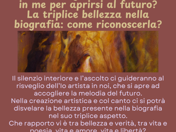 Il silenzio interiore e l’ascolto ci guideranno al risveglio dell’Io artista in noi, che si apre ad accogliere la melodia del futuro. Nella creazione artistica e col canto ci si potrà disvelare la bellezza presente nella biografia nel suo triplice aspetto. Che rapporto vi è tra bellezza e verità, tra vita e poesia, vita e amore, vita e libertà?