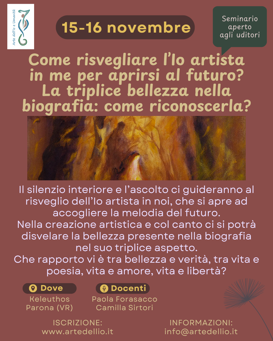 Il silenzio interiore e l’ascolto ci guideranno al risveglio dell’Io artista in noi, che si apre ad accogliere la melodia del futuro. Nella creazione artistica e col canto ci si potrà disvelare la bellezza presente nella biografia nel suo triplice aspetto. Che rapporto vi è tra bellezza e verità, tra vita e poesia, vita e amore, vita e libertà?