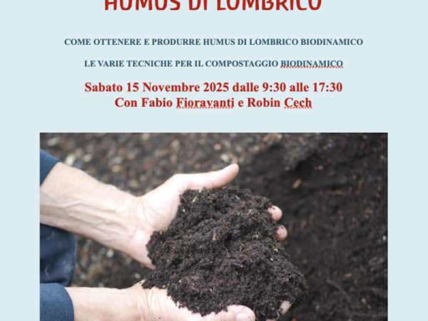 Portare vita al vivente. La formazione dell’humus. Valorizzazione e usi del compost. I preparati biodinamici. La corretta concimazione come base della fertilità del terreno. Le fasi del compostaggio. Regole principali per un corretto compostaggio (sia a livello aziendale che domestico). Ruolo e funzione del lombrico. L’importanza del lombrico. La produzione dell’humus di lombrico. Aspetti pratici del compostaggio. Aspetti pratici per la produzione di humus di lombrico. Uso di argilla, basalto e altri componenti.