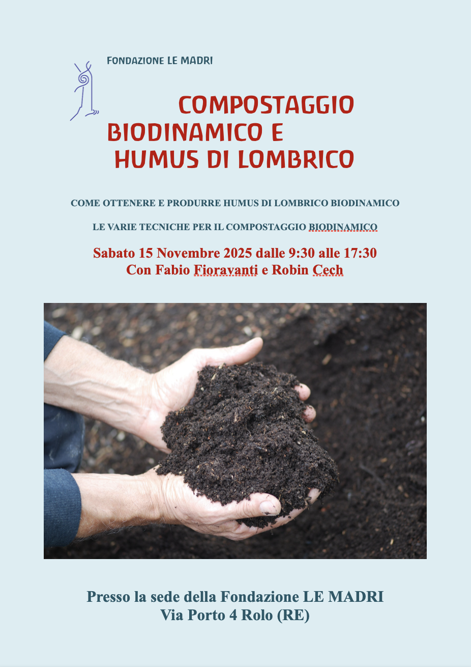 Portare vita al vivente. La formazione dell’humus. Valorizzazione e usi del compost. I preparati biodinamici. La corretta concimazione come base della fertilità del terreno. Le fasi del compostaggio. Regole principali per un corretto compostaggio (sia a livello aziendale che domestico). Ruolo e funzione del lombrico. L’importanza del lombrico. La produzione dell’humus di lombrico. Aspetti pratici del compostaggio. Aspetti pratici per la produzione di humus di lombrico. Uso di argilla, basalto e altri componenti.