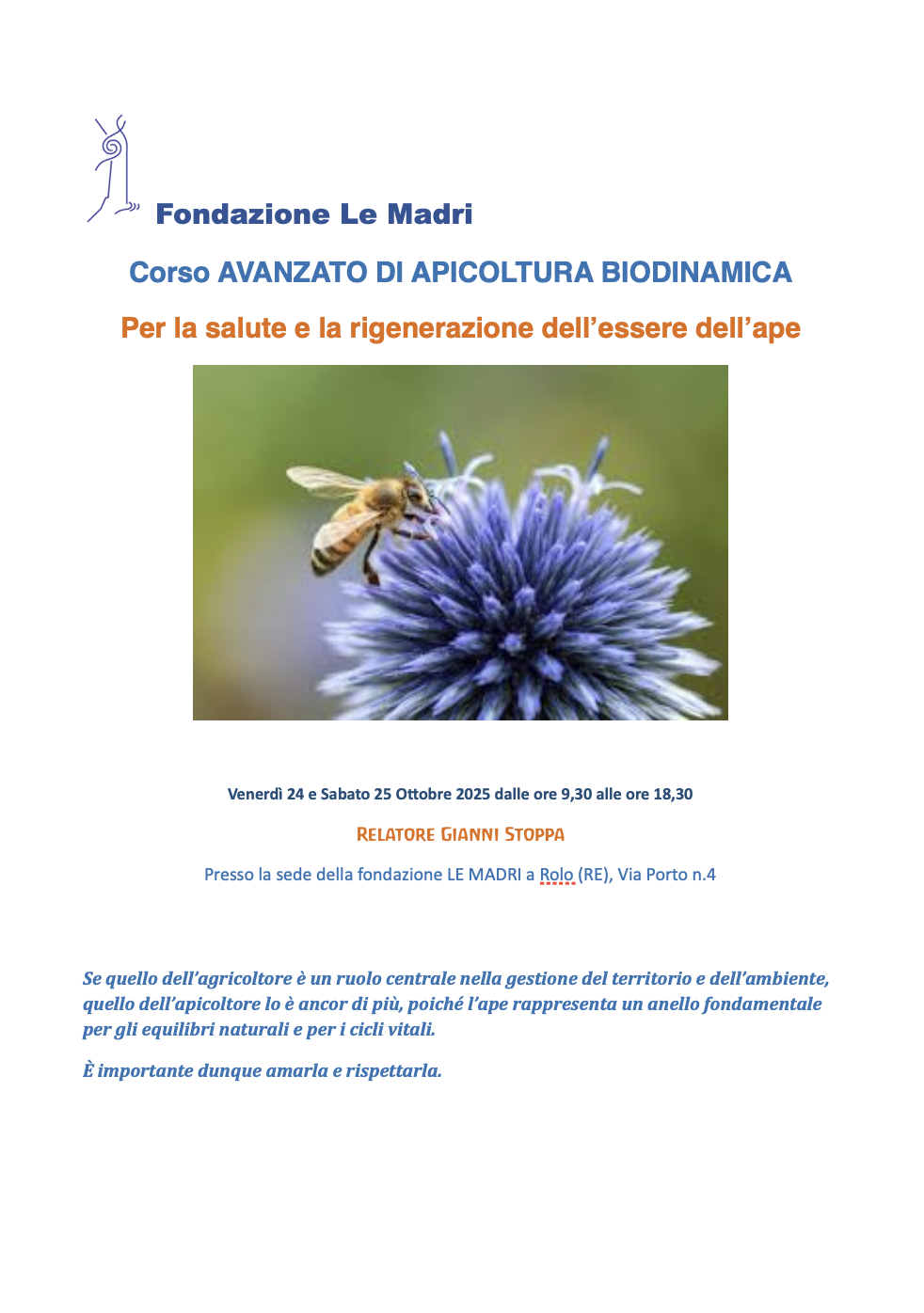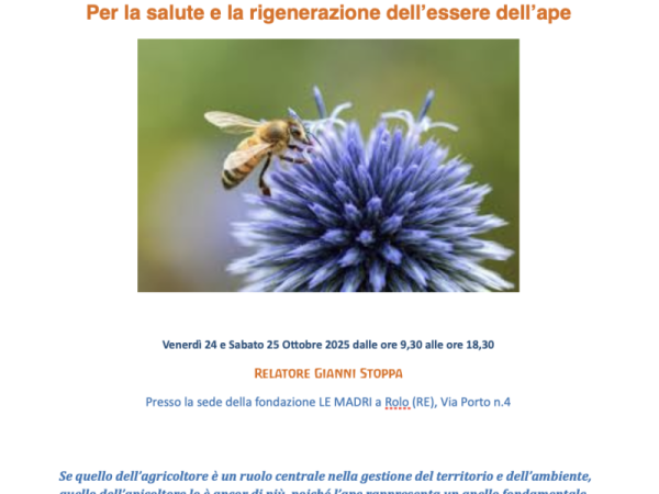 Sarà attivo il servizio di ristorazione interna con prodotti biodinamici e biologici (pranzi del 24 e 25 Ottobre). Il pranzo prevede menu vegetariano con materie prime biologiche e biodinamiche. Per motivi di tempo legati al rispetto del programma, non sarà possibile preparare pietanze o altri piatti diversi e/o personalizzati. Vi chiediamo, per motivi organizzativi, di prenotare i pasti al momento dell’iscrizione. La quota è di 18,00 € per ogni pasto e va versata direttamente in sede all’arrivo Termine iscrizioni 18 Ottobre 2025 Se quello dell’agricoltore è un ruolo centrale nella gestione del territorio e dell’ambiente, quello dell’apicoltore lo è ancor di più, poiché l’ape rappresenta un anello fondamentale per gli equilibri naturali e per i cicli vitali. È importante dunque amarla e rispettarla.