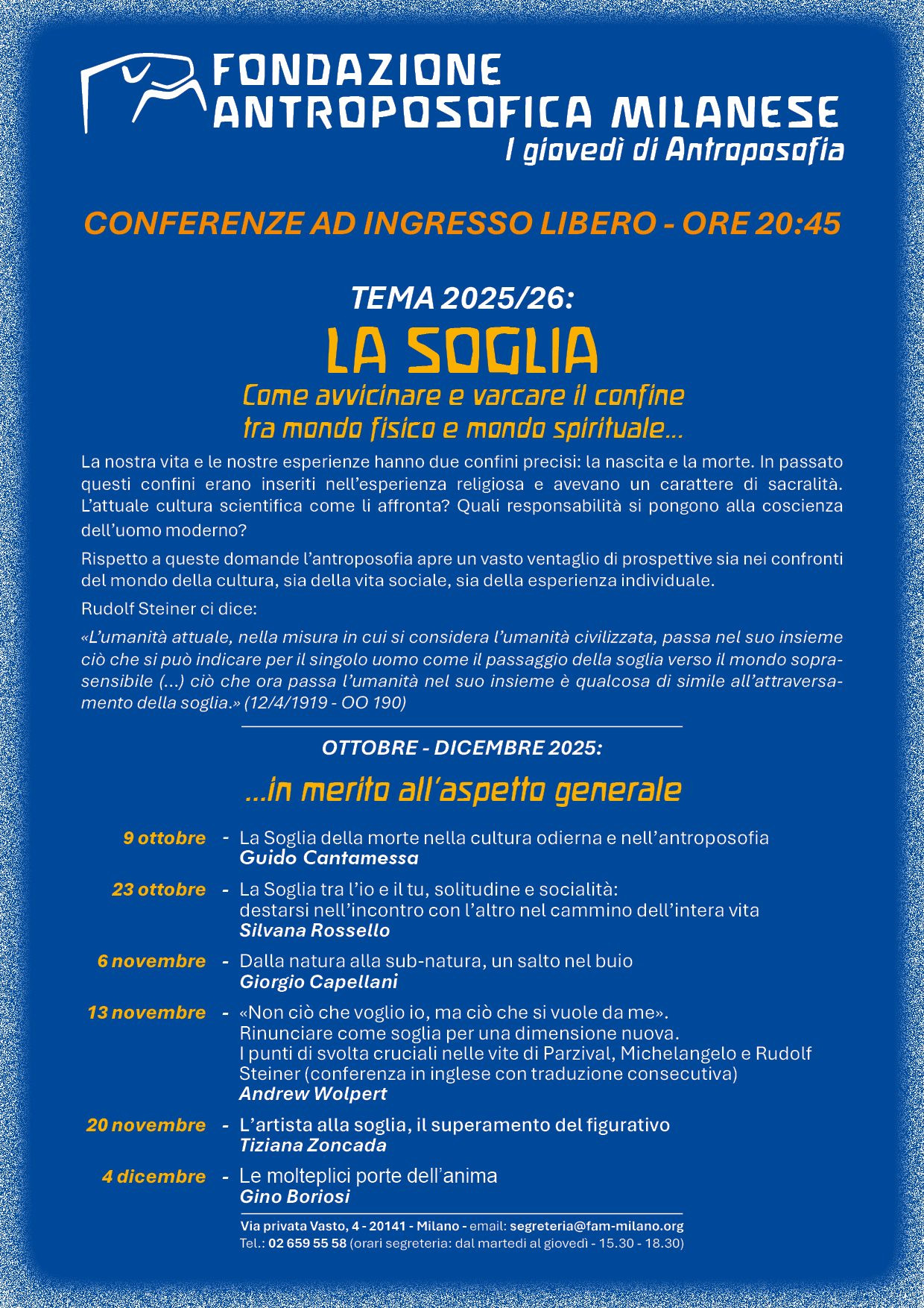 I giovedì di Antroposofia CONFERENZE AD INGRESSO LIBERO - ORE 20:45 TEMA 2025/26: LA SOGLIA Come avvicinare e varcare il confine tra mondo fisico e mando spirituale...