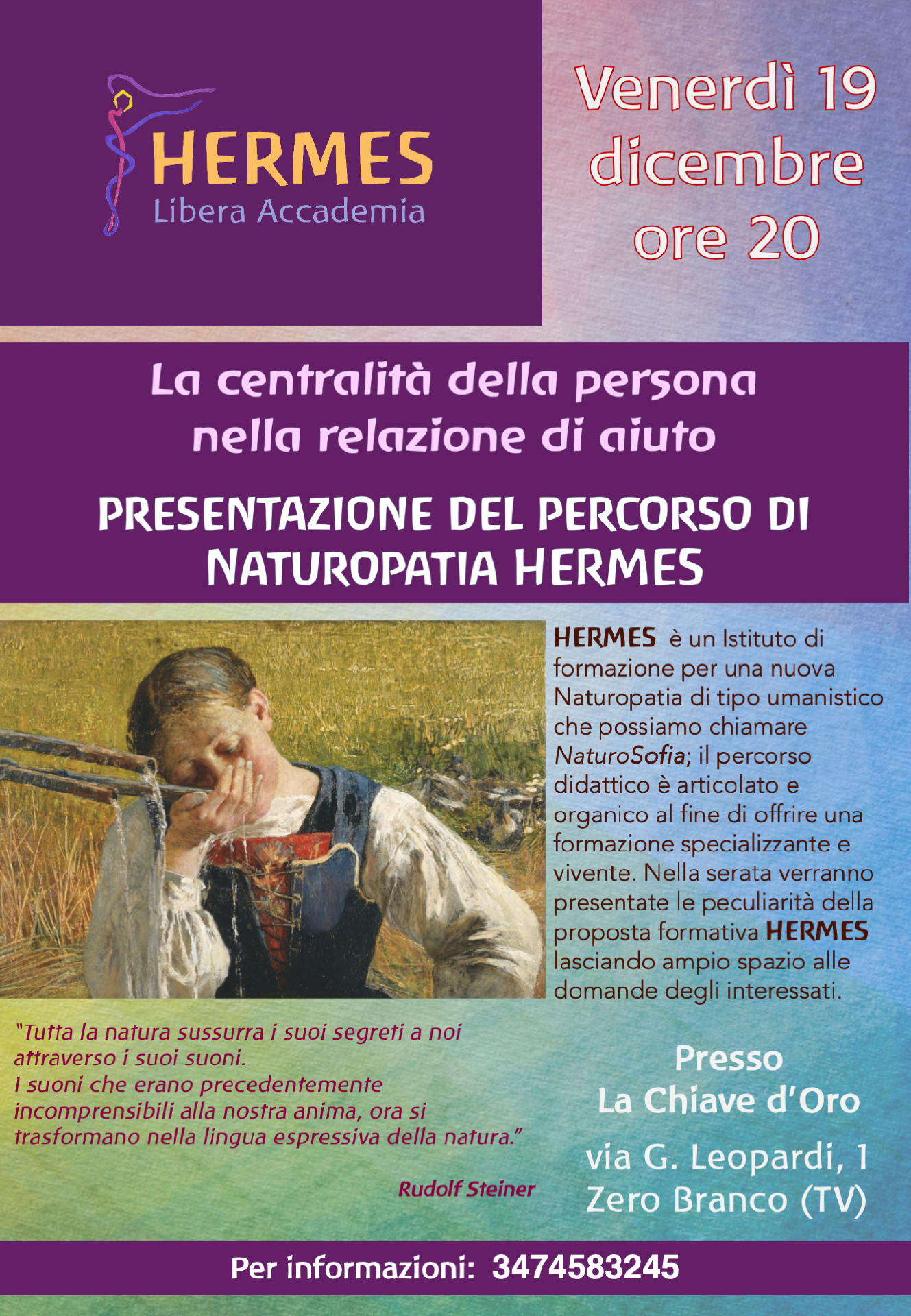 HERMES è un Istituto di formazione per una nuova Naturopatia di tipo umanistico che possiamo chiamare NaturoSofia; il percorso didattico è articolato e organico al fine di offrire una formazione specializzante e vivente. Nella serata verranno presentate le peculiarità della proposta formativa HERMES lasciando ampio spazio alle domande degli interessati.
