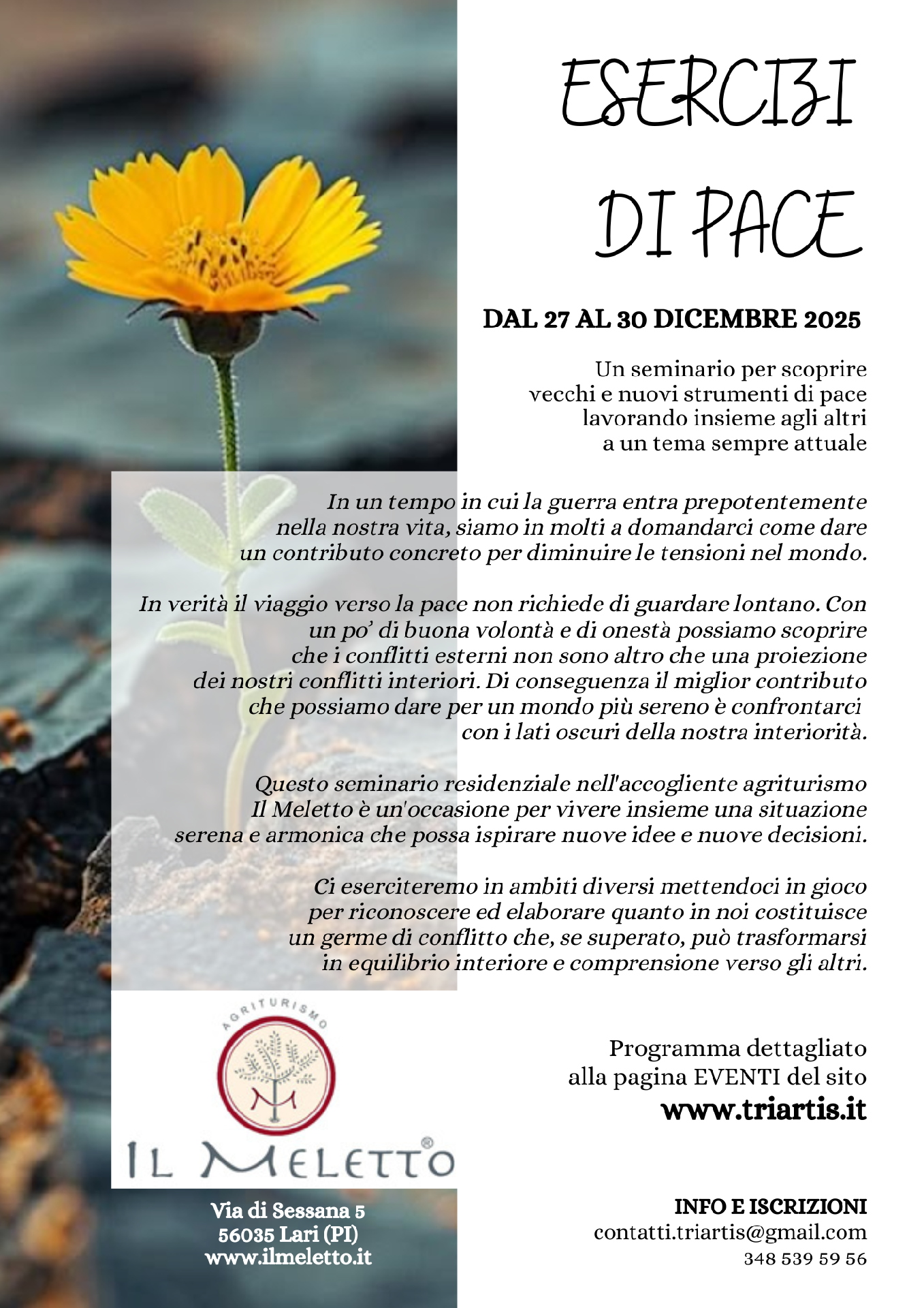 Un seminario per scoprire vecchi e nuovi strumenti di pace lavorando insieme agli altri a un tema sempre attuale In un tempo in cui la guerra entra prepotentemente nella nostra vita, siamo in molti a domandarci come dare un contributo concreto per diminuire le tensioni nel mondo. In verità il viaggio verso la pace non richiede di guardare lontano. Con un po’ di buona volontà e di onestà possiamo scoprire che i conflitti esterni non sono altro che una proiezione dei nostri conflitti interiori. Di conseguenza il miglior contributo che possiamo dare per un mondo più sereno è di confrontarci con i nostri conflitti e le nostre tensioni interiori. Questo seminario residenziale nell’accogliente agriturismo Il Meletto è un’occasione per vivere insieme una situazione serena e armonica che possa ispirare nuove idee e nuove decisioni. Ci eserciteremo in ambiti diversi mettendoci in gioco per riconoscere ed elaborare quanto in noi costituisce un germe di conflitto che, se superato, può trasformarsi in equilibrio interiore e comprensione verso gli altri. Dalla teoria alla pratica: Non solo riflessioni, ma giochi ed esercizi, dinamiche di gruppo e momenti creativi per trasformare i conflitti in comprensione attiva. Un’oasi di rigenerazione: quattro giorni lontani dal caos delle festività classiche, immersi nella tranquillità della natura per una profonda rigenerazione mentale e spirituale. Connessione e condivisione: Un ambiente accogliente e rigenerante dove è possibile riscoprire l’arte dell’ascolto e della cooperazione. Inizia l’anno rinnovato: Un’occasione preziosa per fare il punto, lasciare andare le vecchie tensioni e iniziare il nuovo anno con una mente e un cuore pieni di nuove idee.
