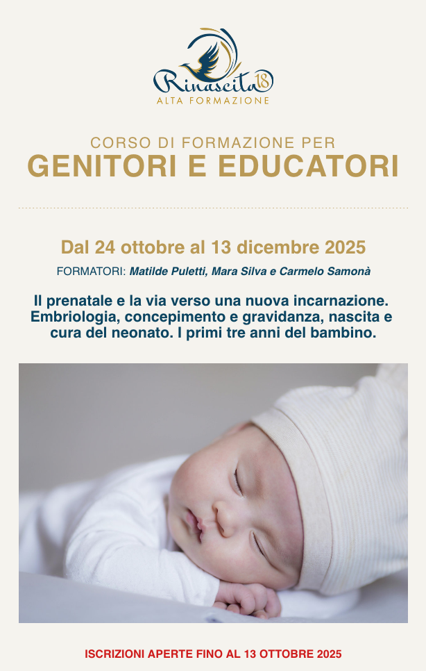 Formatori: Matilde Puletti, Mara Silva e Carmelo Samonà Il prenatale e la via verso una nuova incarnazione. Embriologia, concepimento e gravidanza, nascita e cura del neonato. I primi tre anni del bambino.