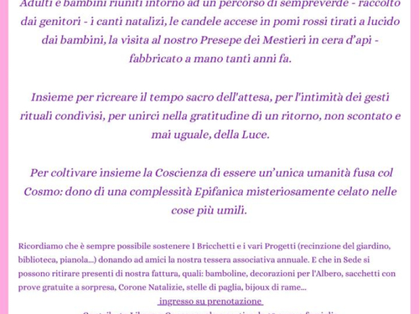 Adulti e bambini riuniti intorno a un percorso di sempreverde - raccolto dai genitori - i canti natalizi, le candele accese, i pomirossi tirati a lucido dai bambini, la visita al nostro presepe dei mestieri in cera d'api fabbricato a mano tanti anni fa.