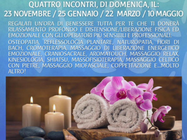 Regalati un'ora di benessere tutta per te che ti donerà rilassamento profondo e distensione/liberazione fisica ed emozionale con gli operatori più sensibili e professionali. Osteopatia, Reflessologia Plantare, Naturopatia, Fiori Di Bach, Cromoterapia, Massaggio Di Liberazione Energetico Emozionale, Craniosacrale, Aromatouch, Massaggio Relax, Kinesiologia, Shiatsu, Massofisioterapia, Massaggio Celtico Con Pietre, Massaggio Miofasciale, Coppettazione e...molto altro!