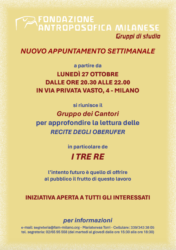 Per informazioni: e-mail: segreteria@fam-milano.org Tel.: 02/65 95 558 (dal martedì al giovedì dalle 15:30 alle 18:30) Cellulare: 339/343 38 05 (Mariateresa Torri)