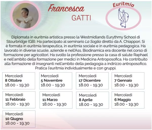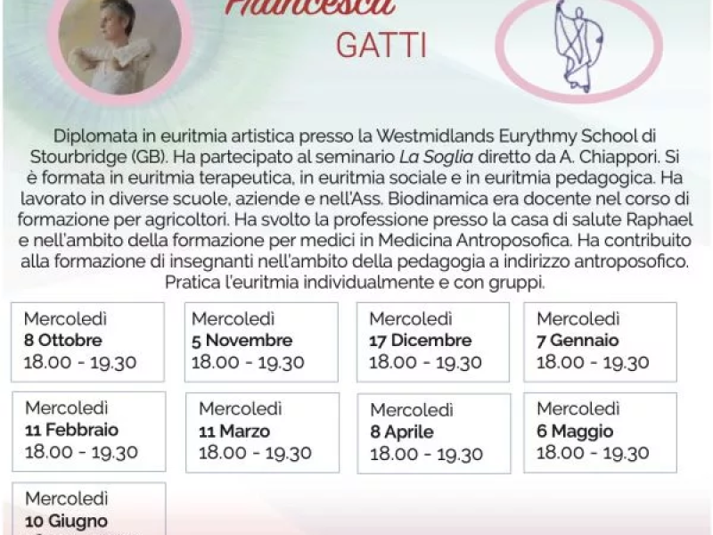Le mete Cosa portano poesia e musica, quando vissute in modo euritmico dal mio intero essere, alla mia capacità di essere presente e, dunque, di pensare? Ci prenderemo cura di questa domanda in modo pratico attraverso l’euritmia delle vocali, degli intervalli e delle scale musicali, con la forma disegnata da Rudolf Steiner per la lirica di Shakespeare dedicata ad Orfeo, creando semplici movimenti corali in lieto ascolto della musica suonata dal vivo, trovando elementari sequenze di gesti musicali anche da esercitare a casa per chi lo desidera. Il Laboratorio si articolerà in un ciclo di 9 incontri a cadenza mensile. L’arte euritmica è per tutti, non sono richieste conoscenze pregresse. Sono graditi abiti comodi di colore bianco o écru possibilmente senza immagini, scritte o marchi in evidenza, scarpette comode da euritmia o calze antiscivolo.