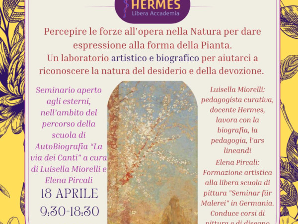 Percepire le forze all'opera nella Natura per fare espressione alla forma della Pianta. Un laboratorio artistico e biografico per aiutarci a riconoscere la natura del desiderio e della devozione. 18 aprile, orario 9:30 – 18:00 19 aprile, orario 9 - 13 Seminario aperto agli esterni, nell’ambito del percorso della scuola di AutoBiografia, La via dei canti. Conducono: Luisella Miorelli, vive in Trentino, educatrice professionale, opera dal 1987 nel sociale, nell’ambito della prevenzione del disagio giovanile, in particolare nella fascia adolescenziale. Diplomata in Pedagogia Curativa presso l’Accademia A. Bargero di Oriago (VE), lavora con la biografia, la pedagogia, l'ars lineandi. Docente presso la Libera Accademia HERMES Elena Pircali, formazione artistica alla libera scuola di Pittura Seminar fur Malerei in Germania. Conduce corsi di pittura e di disegno per bambini e adulti. Presso la Libera Accademia Hermes, via Roma 38, Fontanafredda (Padova) Iscrizioni entro il 13 aprile