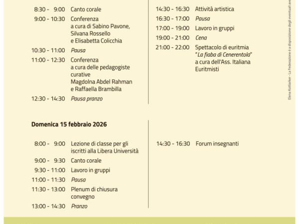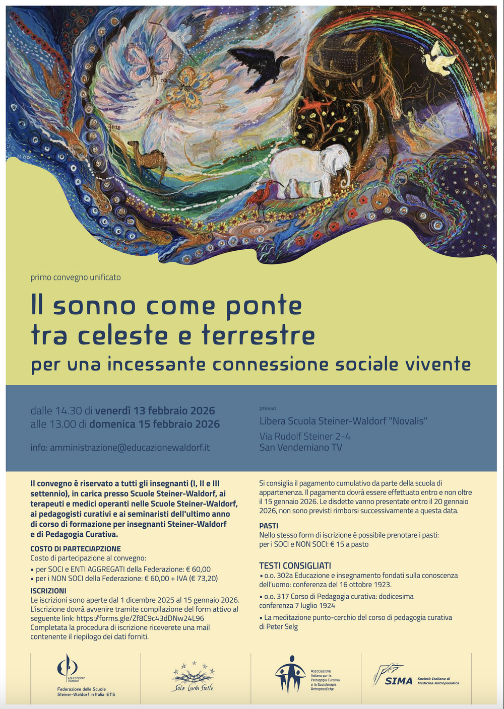 Il convegno è riservato a tutti gli insegnanti (I, II e III settennio) in carica presso le scuole Steiner-Waldorf, ai terapeuti e medici operanti nelle scuole Steiner-Waldorf e ai seminaristi dell’ultimo anno di corso di formazione per insegnanti Steiner-Waldorf e di pedagogia curativa. È organizzato dalla Federazione delle Scuole Steiner Waldorf in Italia, dall’associazione “Sole Luna Stelle”, dalla Associazione Italiana per la pedagogia curativa e la socioterapia antroposofiche e dalla Società Italiana di Medicina Antroposofica.