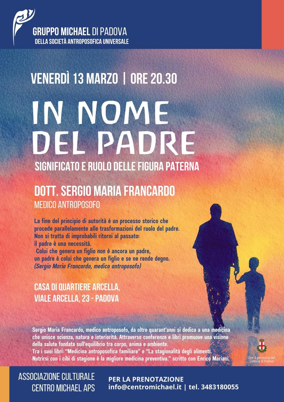 "La fine del principio di autorità è un processo storico che procede parallelamente alle trasformazioni del ruolo del padre. Non si tratta di improbabili ritorni al passato: il padre è una necessità. Colui che genera un figlio non è ancora un padre, un padre è colui che genera un figlio e se ne rende degno." Questo ed altri temi ci verranno presentati dal Dott. Francardo, apprezzato medico antroposofo che da oltre quarant'anni di dedica ad una medicina che unisce scienza, natura e interiorità ed autore di diversi libri tra cui "Medicina antroposofica familiare".