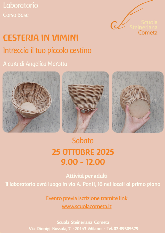 Il laboratorio avrà luogo in via A. Ponti, 16 nei locali al primo piano Dopo un’introduzione teorica sulla cesteria e le tipologie di intreccio, andremo a realizzare un cestino in midollino partendo dalla base di legno. Realizzeremo un intreccio tradizionale, eseguendo insieme tutti i passaggi per capire la tecnica e le proprietà dei vimini. Evento con iscrizione (minimo 8, massimo 12 persone)