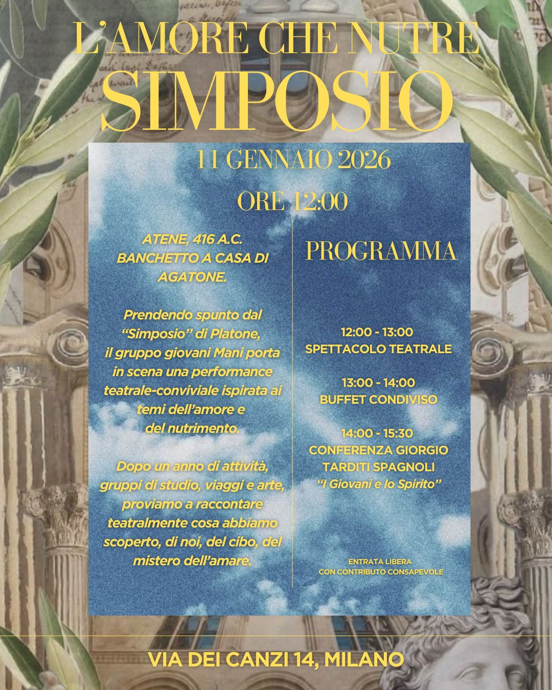 Prendendo spunto dal "Simposio" di Platone, il gruppo giovani Mani porta in scena una performance teatrale-conviviale ispirata ai temi dell'amore e del nutrimento.