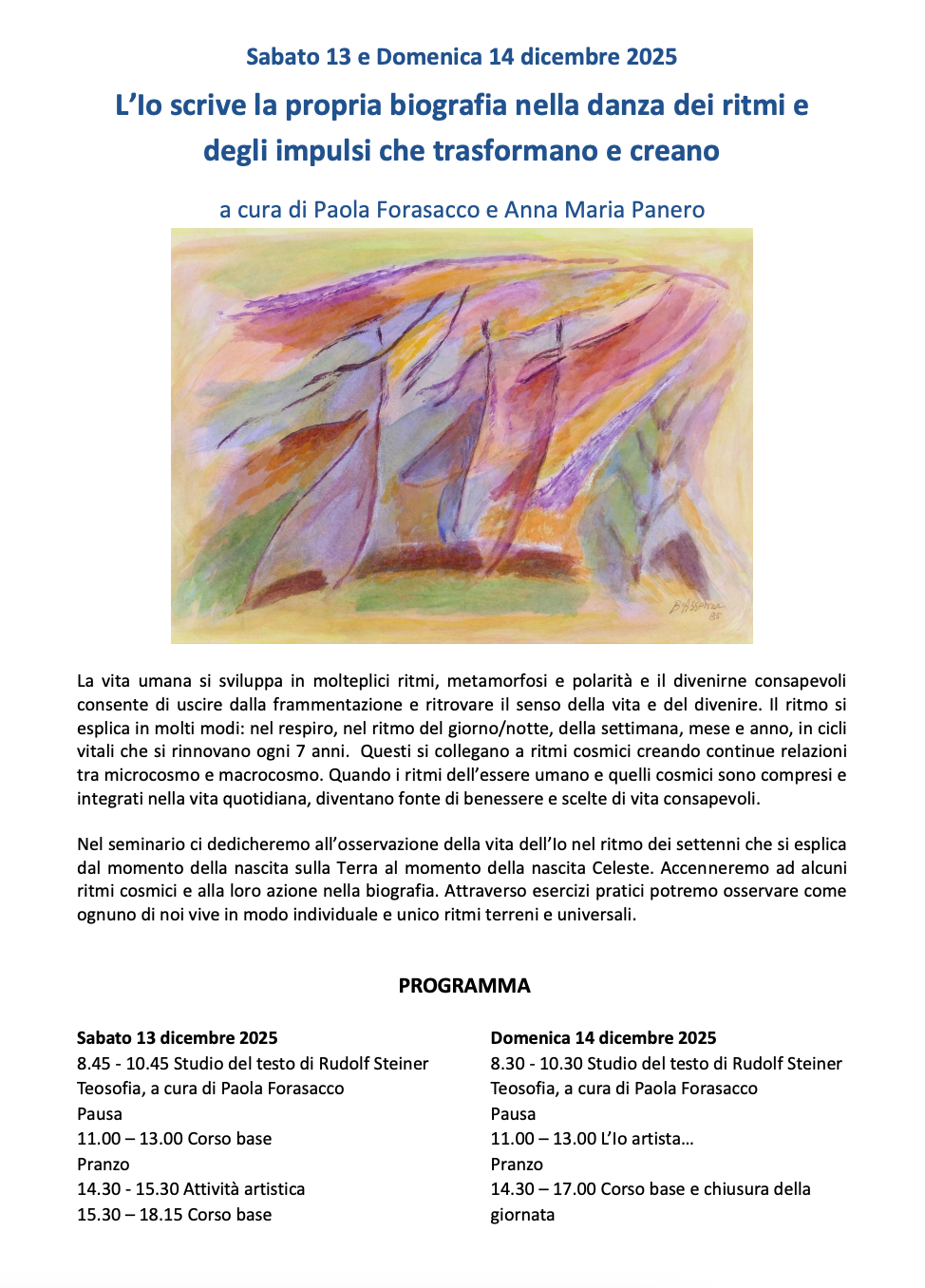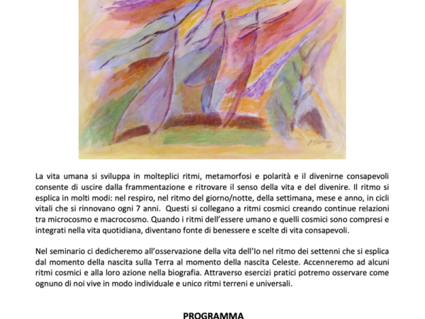 La vita umana si sviluppa in molteplici ritmi, metamorfosi e polarità e il divenirne consapevoli consente di uscire dalla frammentazione e ritrovare il senso della vita e del divenire. Il ritmo si esplica in molti modi: nel respiro, nel ritmo del giorno/notte, della settimana, mese e anno, in cicli vitali che si rinnovano ogni 7 anni. Questi si collegano a ritmi cosmici creando continue relazioni tra microcosmo e macrocosmo. Quando i ritmi dell’essere umano e quelli cosmici sono compresi e integrati nella vita quotidiana, diventano fonte di benessere e scelte di vita consapevoli. Nel seminario ci dedicheremo all’osservazione della vita dell’Io nel ritmo dei settenni che si esplica dal momento della nascita sulla Terra al momento della nascita Celeste. Accenneremo ad alcuni ritmi cosmici e alla loro azione nella biografia. Attraverso esercizi pratici potremo osservare come ognuno di noi vive in modo individuale e unico ritmi terreni e universali