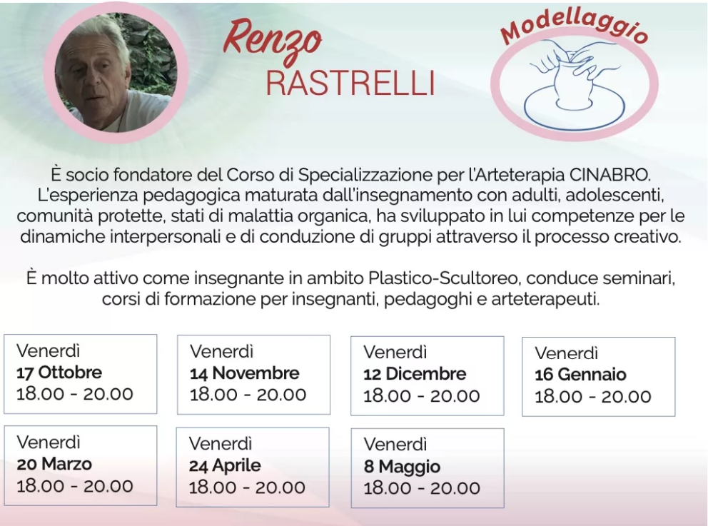 Renzo RASTRELLI È socio fondatore del Corso di Specializzazione per l’Arteterapia CINABRO. L’esperienza pedagogica maturata dall’insegnamento con adulti, adolescenti, comunità protette, stati di malattia organica, ha sviluppato in lui competenze per le dinamiche interpersonali e di conduzione di gruppi attraverso il processo creativo. È molto attivo come insegnante in ambito Plastico-Scultoreo, conduce seminari, corsi di formazione per insegnanti, pedagoghi e arteterapeuti.