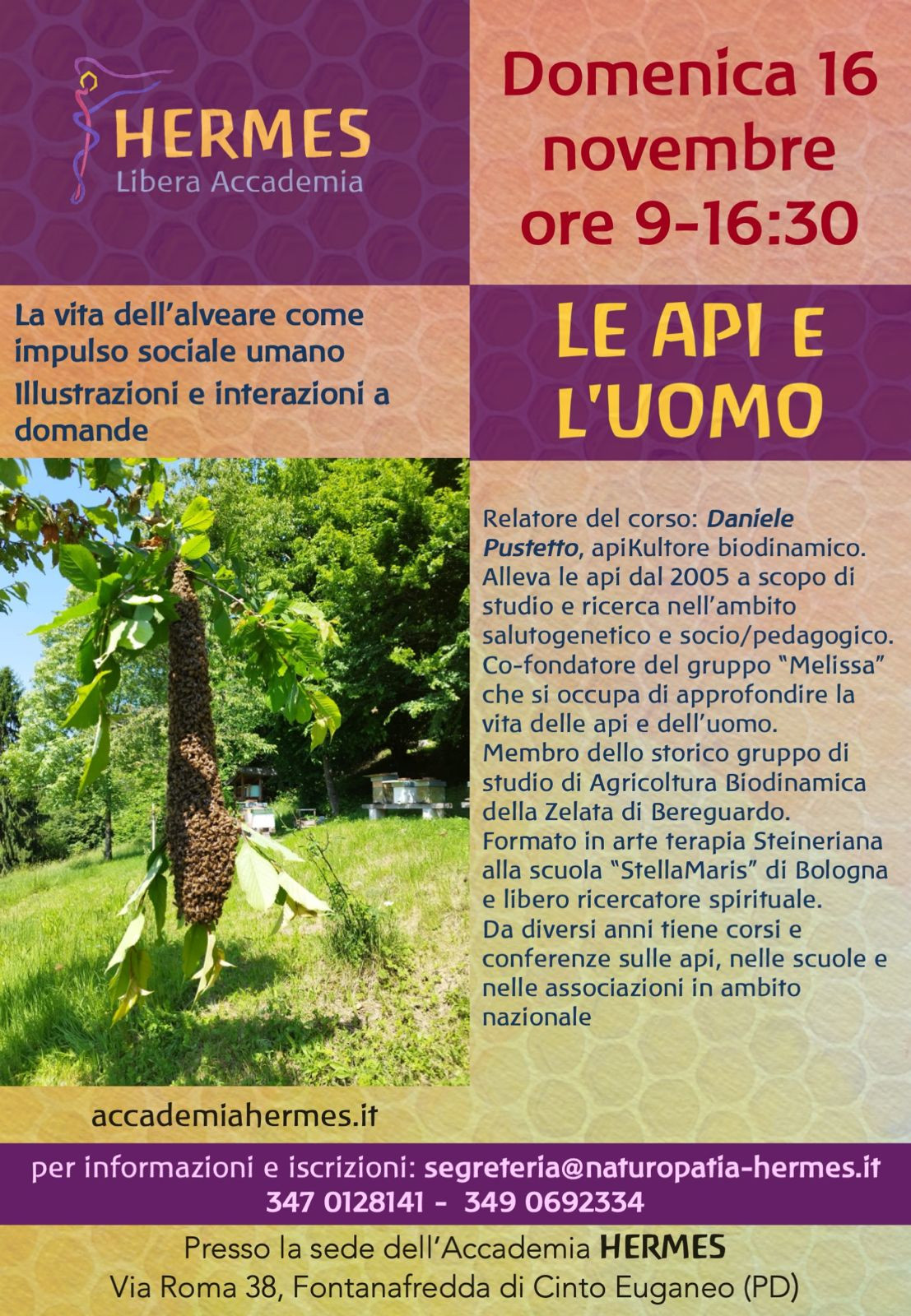 Relatore del corso: Daniele Pustetto, apiKultore biodinamico. Alleva le api dal 2005 a scopo di studio e ricerca nell’ambito salutogenetico e socio/pedagogico. Co-fondatore del gruppo “Melissa” che si occupa di approfondire la vita delle api e dell’uomo. Membro dello storico gruppo di studio di Agricoltura Biodinamica della Zelata di Bereguardo. Formato in arteterapia Steineriana alla scuola “StellaMaris” di Bologna e libero ricercatore spirituale. Da diversi anni tiene corsi e conferenze sulle api, nelle scuole e nelle associazioni in ambito nazionale Presso la Libera Accademia Hermes, via Roma 38, Fontanafredda PD Per informazioni e iscrizioni (entro il 6 novembre). Entrata a libero e responsabile apprezzamento. segreteria@naturopatia-hermes.it