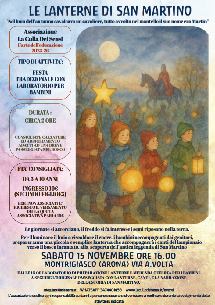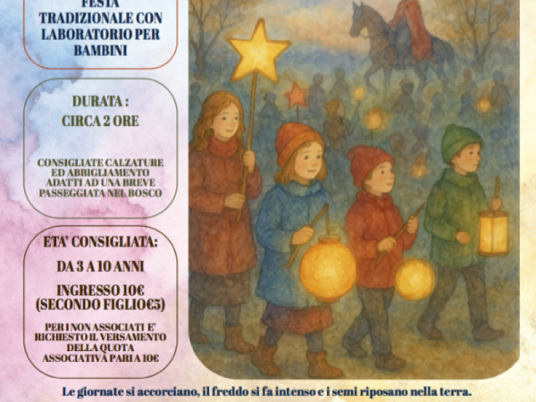Le giornate si accorciano, il freddo si fa intenso e i semi riposano nella terra. Per illuminare il buio e riscaldare il cuore, i bambini accompagnati dai genitori, prepareranno una piccola e semplice lanterna che accompagnerà i canti del lampionaio verso il bosco incantato, alla scoperta dell'antica leggenda di San Martino.