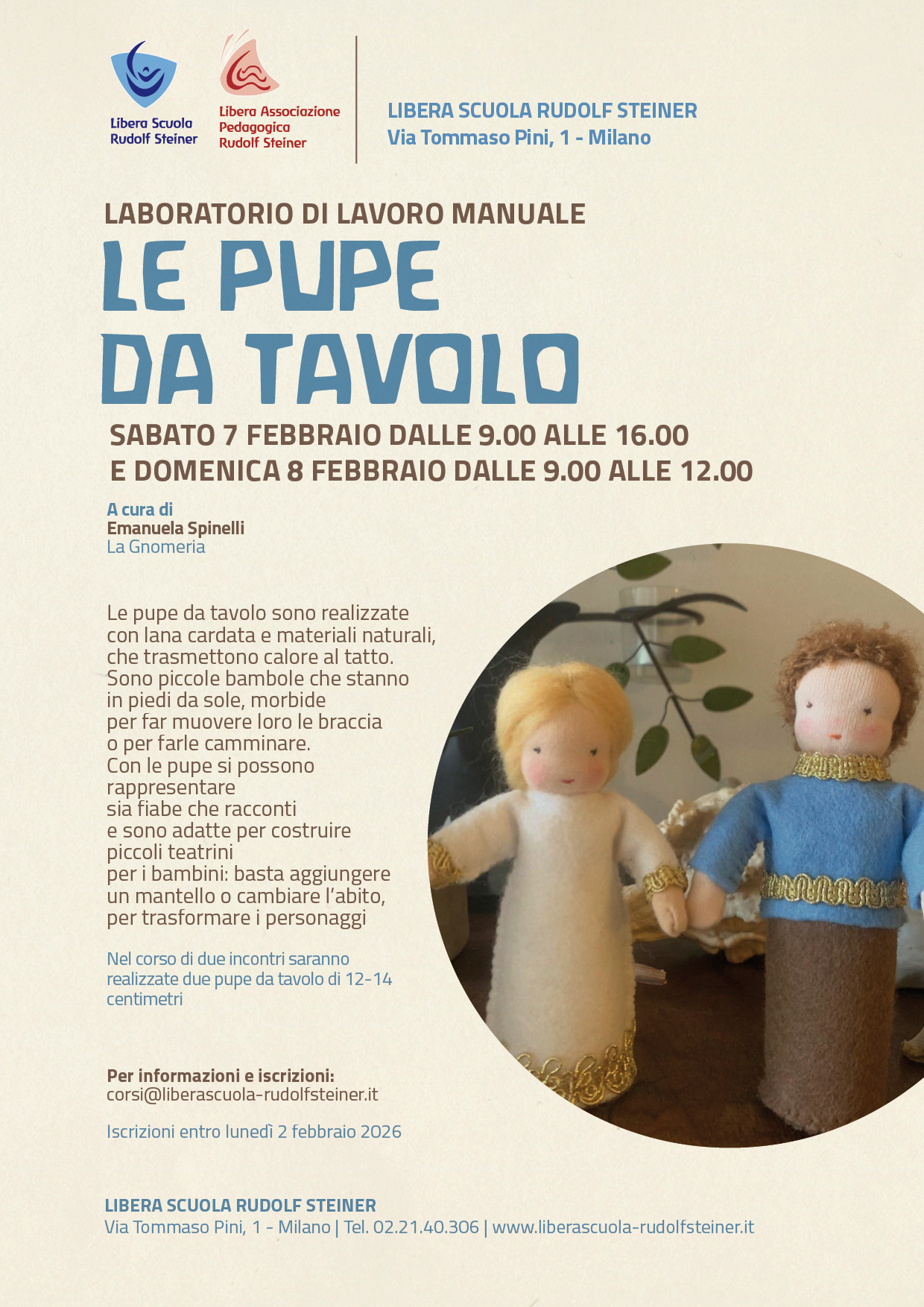 Le pupe da tavolo sono realizzate con lana cardata e materiali naturali, che trasmettono calore al tatto. Sono piccole bambole che stanno in piedi da sole, morbide per far muovere loro le braccia o per farle camminare. Con le pupe si possono rappresentare sia fiabe che racconti e sono adatte per costruire piccoli teatrini per i bambini: basta aggiungere un mantello o cambiare l’abito, per trasformare i personaggi. Nel corso di due incontri saranno realizzate due pupe da tavolo di 12-14 centimetri. Per informazioni: corsi@liberascuola-rudolfsteiner.it