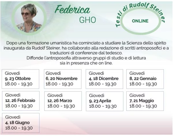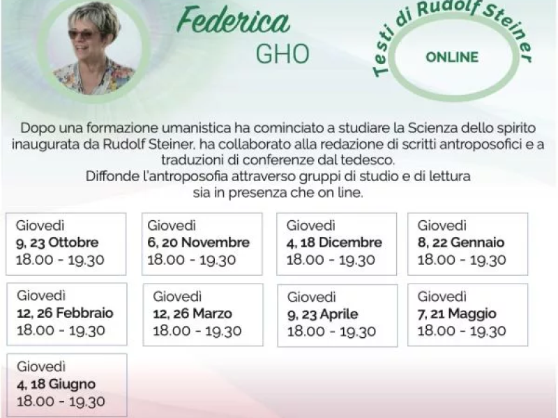 Federica GHO Dopo una formazione umanistica ha cominciato a studiare la Scienza dello spirito inaugurata da Rudolf Steiner, ha collaborato alla redazione di scritti antroposofici e a traduzioni di conferenze dal tedesco. Diffonde l’antroposofia anche attraverso gruppi di studio sia in presenza che online.