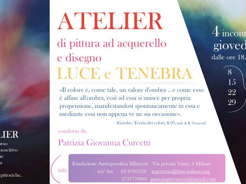 Il corso è aperto anche a nuovi partecipanti.   Non è necessario essere in possesso di tecniche artistiche.   Costo del corso €130 materiale compreso.     Gli incontri si terranno alla Fondazione Antroposofica Milanese - Via Privata Vasto, 4 a Milano     Per informazioni potete contattare Patrizia Curcetti al seguente numero 3737776901 o scrivendo una mail a patriziagiocurcetti@gmail.com