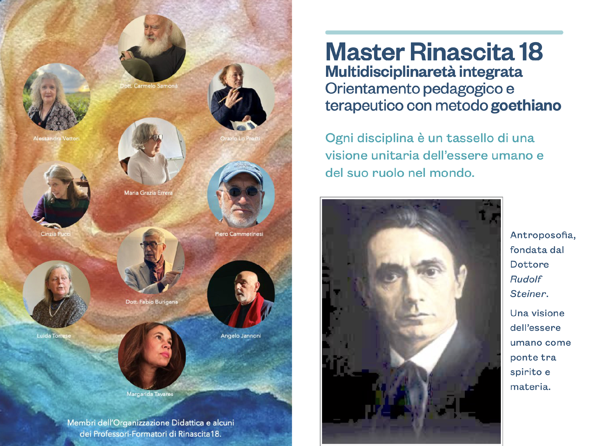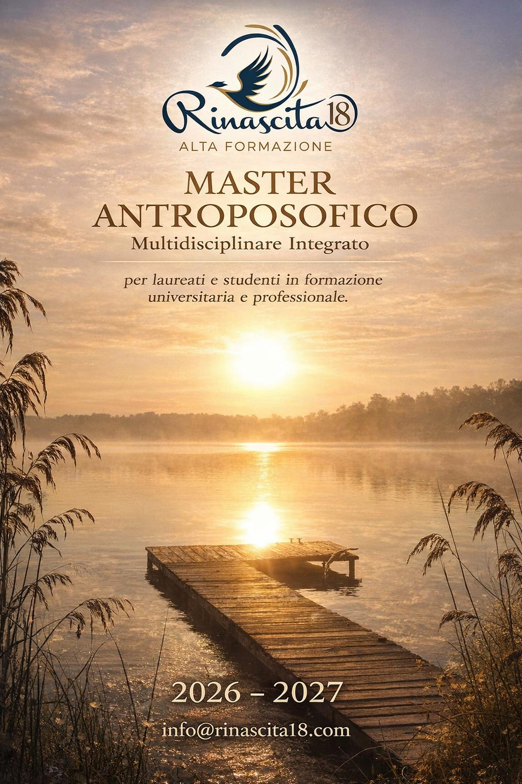 Formazione multidisciplinare integrata Il Master Antroposofico di Rinascita 18 è un percorso di alta formazione multidisciplinare integrata, ispirato all’antroposofia di Rudolf Steiner, che si rivolge a educatori, operatori della salute, artisti, terapeuti e a tutti coloro che operano nei contesti educativi, sociali e culturali. Il Master nasce dall’esigenza di offrire una formazione che consideri l’essere umano nella sua unità di corpo, anima e spirito, mettendo in dialogo i diversi ambiti del sapere e dell’agire umano.
