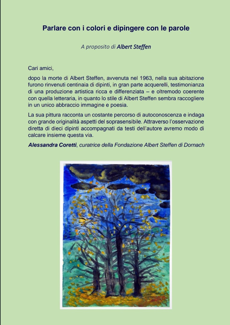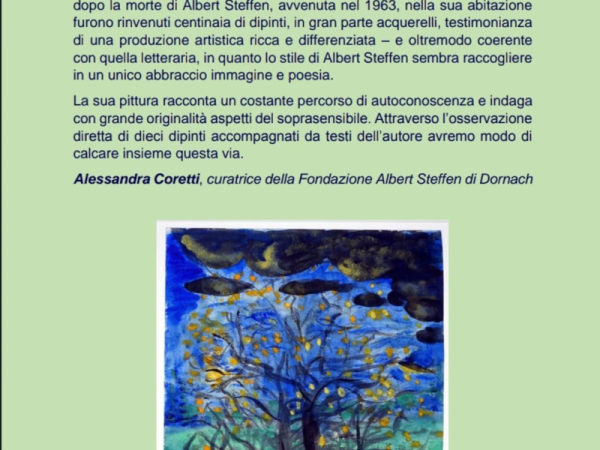 Cari amici, dopo la morte di Albert Steffen, avvenuta nel 1963, nella sua abitazione furono rinvenuti centinaia di dipinti, in gran parte acquerelli, testimonianza di una produzione artistica ricca e differenziata - e oltremodo coerente con quella letteraria, in quanto lo stile di Albert Steffen sembra raccogliere in un unico abbraccio immagine e poesia. La sua pittura racconta un costante percorso di autoconoscenza e indaga con grande originalità aspetti del soprasensibile. Attraverso l'osservazione diretta di dieci dipinti accompagnati da testi dell'autore avremo modo di calcare insieme questa via.