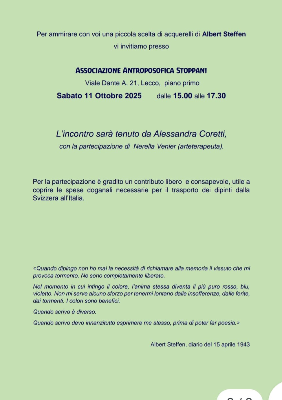 Per ammirare con voi una piccola scelta di acquerelli di Albert Steffen vi invitiamo presso ASSOCIAZIONE ANTROPOSOFICA STOPPANI Viale Dante A. 21, Lecco, piano primo Sabato 11 Ottobre 2025 dalle 15.00 alle 17.30