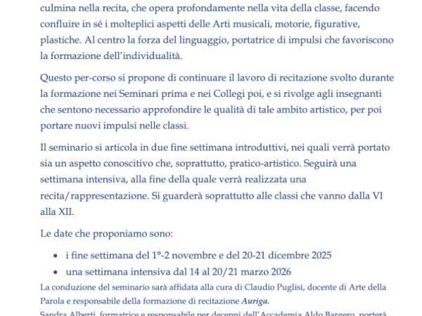 Questo per-corso si propone di continuare il lavoro di recitazione svolto durante la formazione nei Seminari prima e nei Collegi poi, e si rivolge agli insegnanti che sentono necessario approfondire le qualità di tale ambito artistico, per poi portare nuovi impulsi nelle classi.