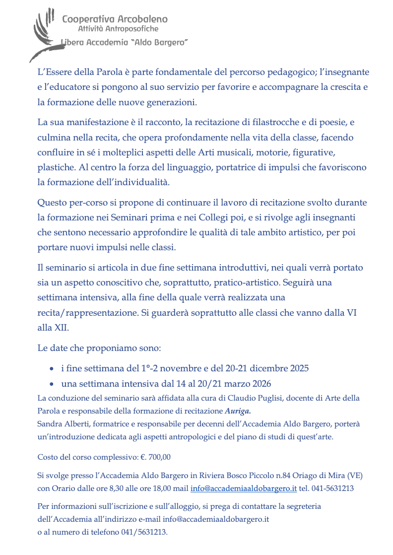 Le date che proponiamo sono: • i fine settimana del 1°-2 novembre e del 20-21 dicembre 2025 • una settimana intensiva dal 14 al 20/21 marzo 2026 La conduzione del seminario sarà affidata alla cura di Claudio Puglisi, docente di Arte della Parola e responsabile della formazione di recitazione Auriga. Sandra Alberti, formatrice e responsabile per decenni dell’Accademia Aldo Bargero, porterà un’introduzione dedicata agli aspetti antropologici e del piano di studi di quest’arte.