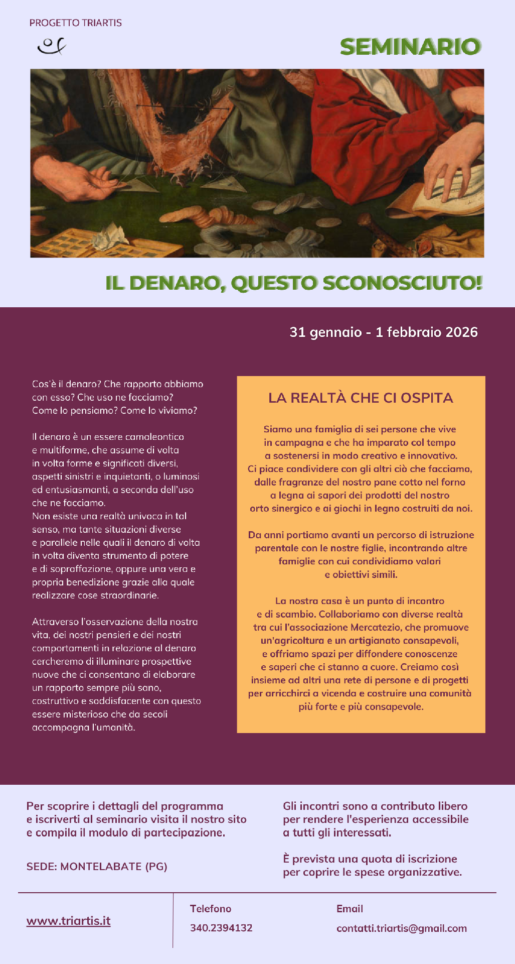 Cos’è il denaro? Che rapporto abbiamo con esso? Che uso ne facciamo? Come lo pensiamo? Come lo viviamo? Il denaro è un essere camaleontico e multiforme, che assume di volta in volta forme e significati diversi, aspetti sinistri e inquietanti, o luminosi ed entusiasmanti, a seconda dell’uso che ne facciamo. Non esiste una realtà univoca in tal senso, ma tante situazioni diverse e parallele nelle quali il denaro di volta in volta diventa strumento di potere e di sopraffazione, oppure una vera e propria benedizione grazie alla quale realizzare cose straordinarie. Attraverso l’osservazione della nostra vita, dei nostri pensieri e dei nostri comportamenti in relazione al denaro cercheremo di illuminare prospettive nuove che ci consentano di elaborare un rapporto sempre più sano, costruttivo e soddisfacente con questo essere misterioso che da secoli accompagna l’umanità.