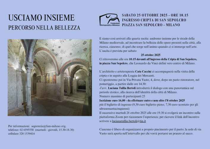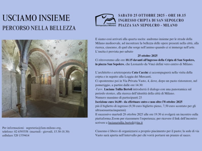 E siamo così arrivati alla quarta uscita: andremo insieme per le strade della Milano medioevale, ad incontrare la bellezza delle opere presenti nella città, alla ricerca, ciascuno, di quel che sorge nell'animo quando ci si immerge nell'arte.