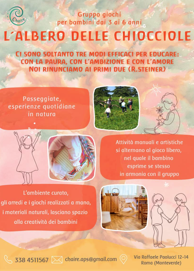Chaire è un’associazione senza scopo di lucro, laica e apolitica, che promuove iniziative in ambito sociale, culturale, artistico e pedagogico seguendo gli impulsi e gli insegnamenti di Rudolf Steiner. L’Associazione opera a Roma nel cuore del quartiere Monteverde e gestisce uno spazio accogliente e curato, un luogo di incontro e di condivisione per grandi e piccini; un angolo di “respiro” e di “crescita” che mette al centro l’individuo con i propri talenti e potenzialità. Chaire nasce con l’intento di sostenere ogni essere umano nella sua crescita individuale e a tale scopo organizza conferenze, seminari e momenti di studio e condivisione aperti a tutti gli interessati, oltre ad attività artistiche e manuali per adulti, adolescenti e bambini. L’Accoglienza dei bambini e il sostegno alle famiglie rappresentano la nostra principale vocazione.