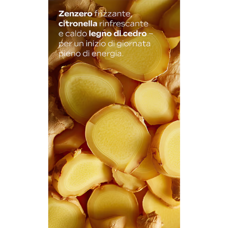 Il profumo vivace dello zenzero, unito alle note rinfrescanti di citronella e quelle calde del legno di cedro, rendono questo doccia gel perfetto per iniziare la giornata con il giusto pieno di energia!