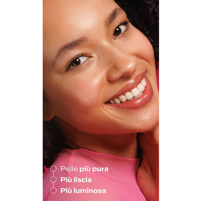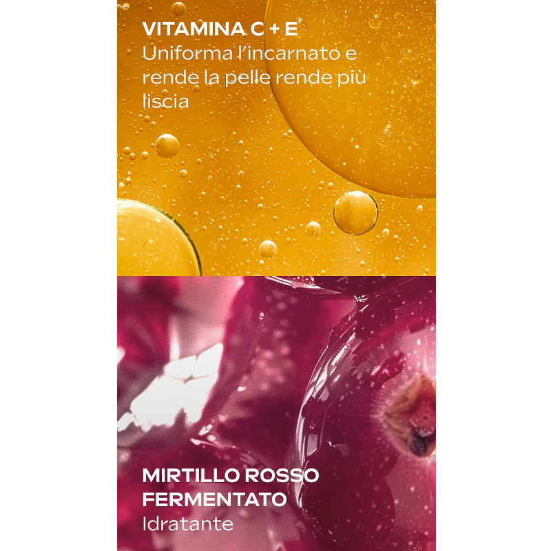 Pori minimizzati e una texture della pelle più uniforme: il Siero Multivitaminico dona luminosità alla pelle impura e spenta grazie alle vitamine C ed E e al mirtillo fermentato.