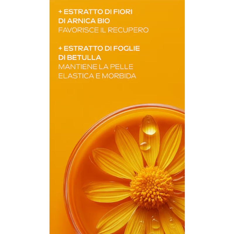 INCI: Helianthus Annuus (Sunflower) Seed Oil - Olea Europaea (Olive) Fruit Oil - Fragrance (Parfum) - Arnica Montana Flower Extract - Betula Alba Leaf Extract - Limonene - Linalool - Geraniol - Coumarin 1 From natural essential oils / da oli essenziali naturali 2 From natural essential oils /da oli essenziali naturali 3 From natural essential oils da oli essenziali naturali