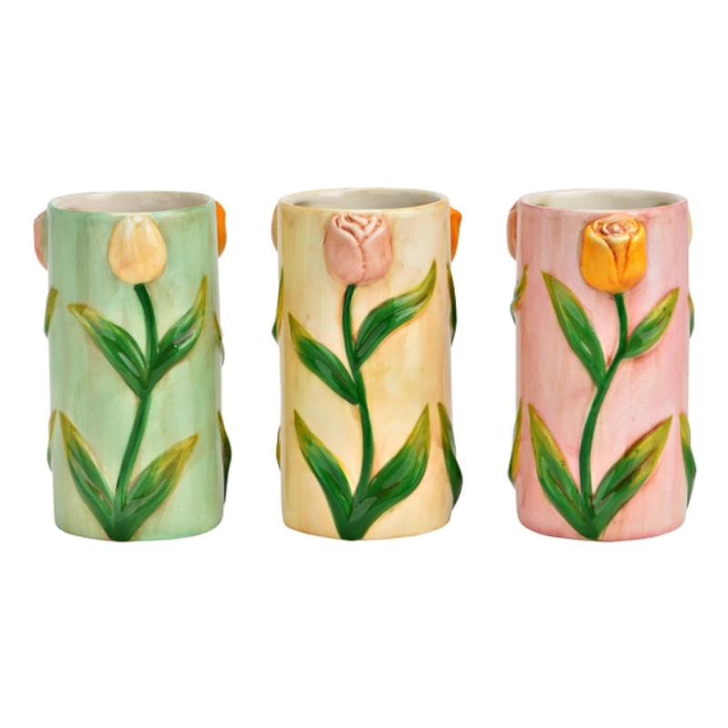 Vasi per i fiori in ceramica colorata con disegni di tulipani