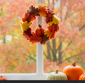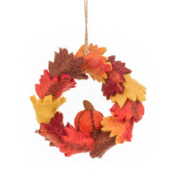Realizzata in belle foglie di feltro screziate in una serie di vibranti colori autunnali, ognuna delle mani cucita su una ghirlanda di filo avvolto in feltro, con una zucca in feltro perfettamente plumta appollaiata perfettamente al centro.