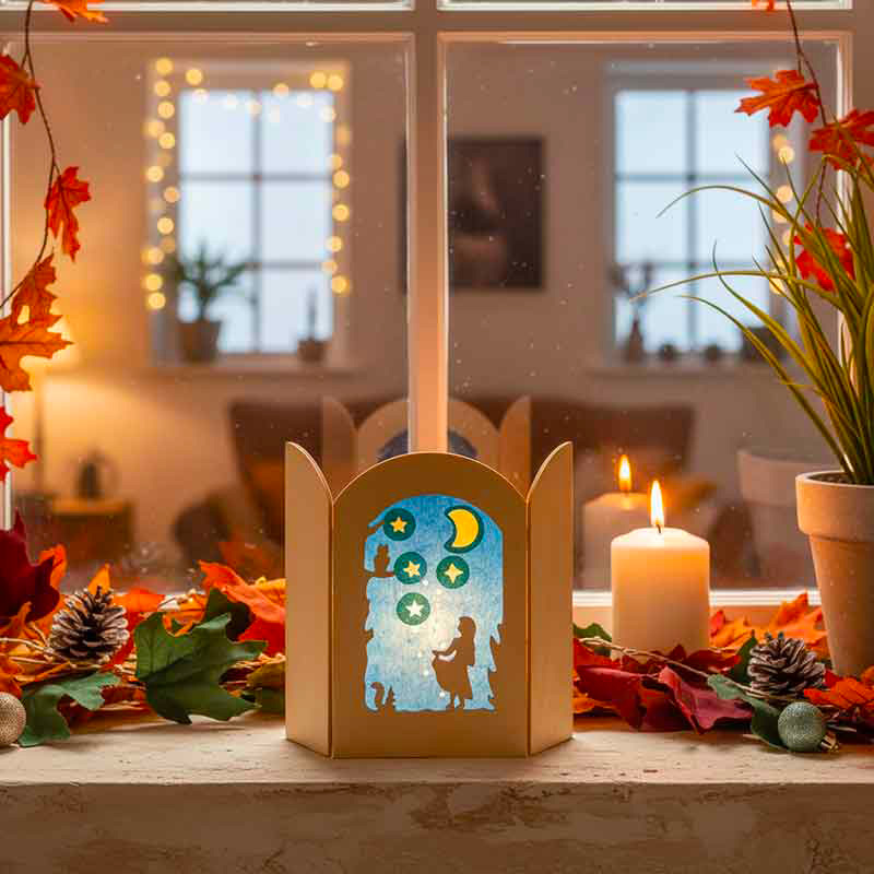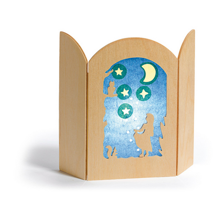 Un quadretto in legno che stà in piedi da solo (con due antine laterali), con disegnate delle sagome in legno e carta velina.