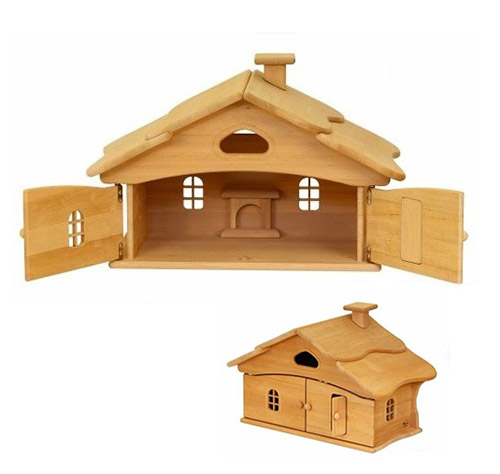 Questa bellissima casa delle bambole in legno massello ha le ante/pareti totalmente apribili per giocare agevolmente con le bambole all'interno, una deliziosa porticina ed un piccolo camino.