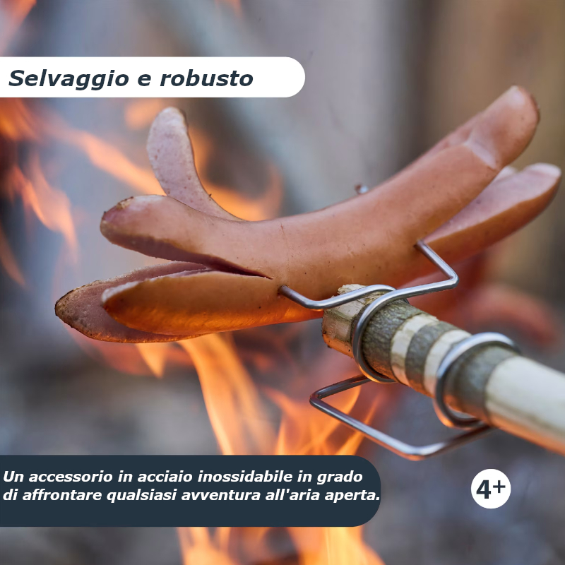 Il compagno del barbecue con doppia punta è esattamente ciò che è necessario per impalare correttamente alla prossima cena di sopravvivenza intorno al fuoco da campo. Che si tratti di marshmallow, verdure o salsicce, tutto è tranquillamente sfrigolato sul fuoco.