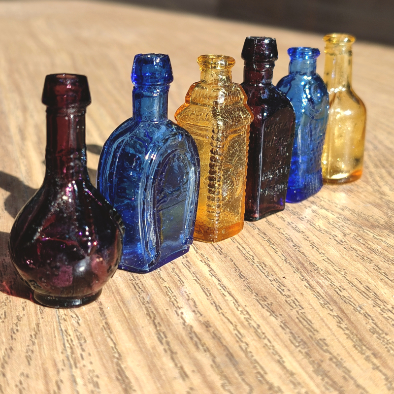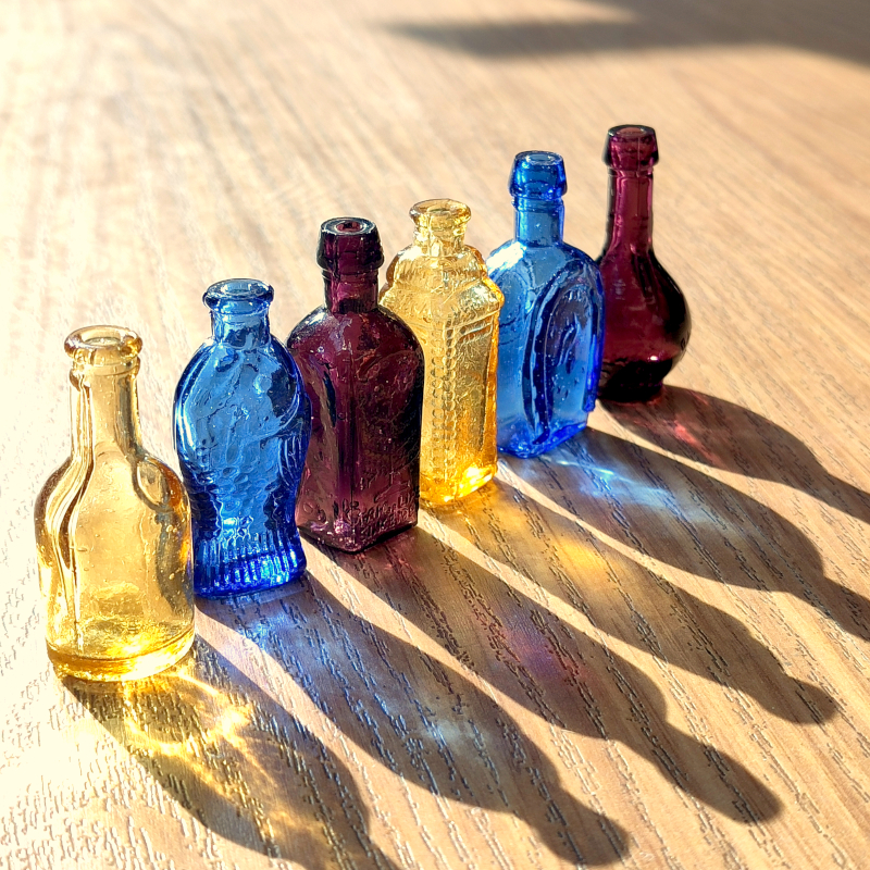 Piccolo bottigliette colorate in vetro.