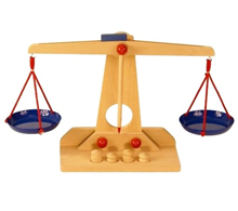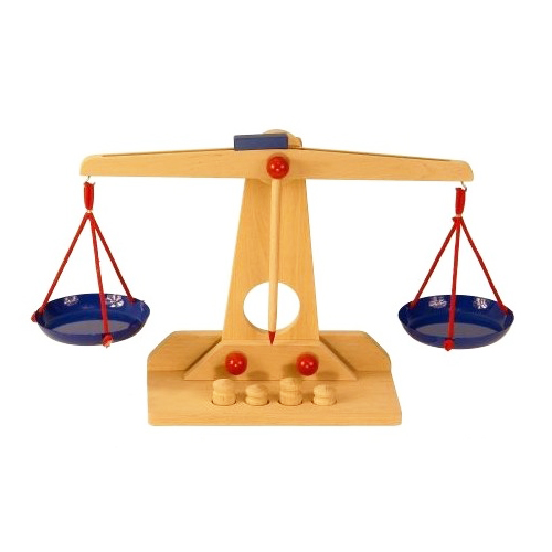 Bilancia in legno per bambini con piatti in metallo e pesi in legno.